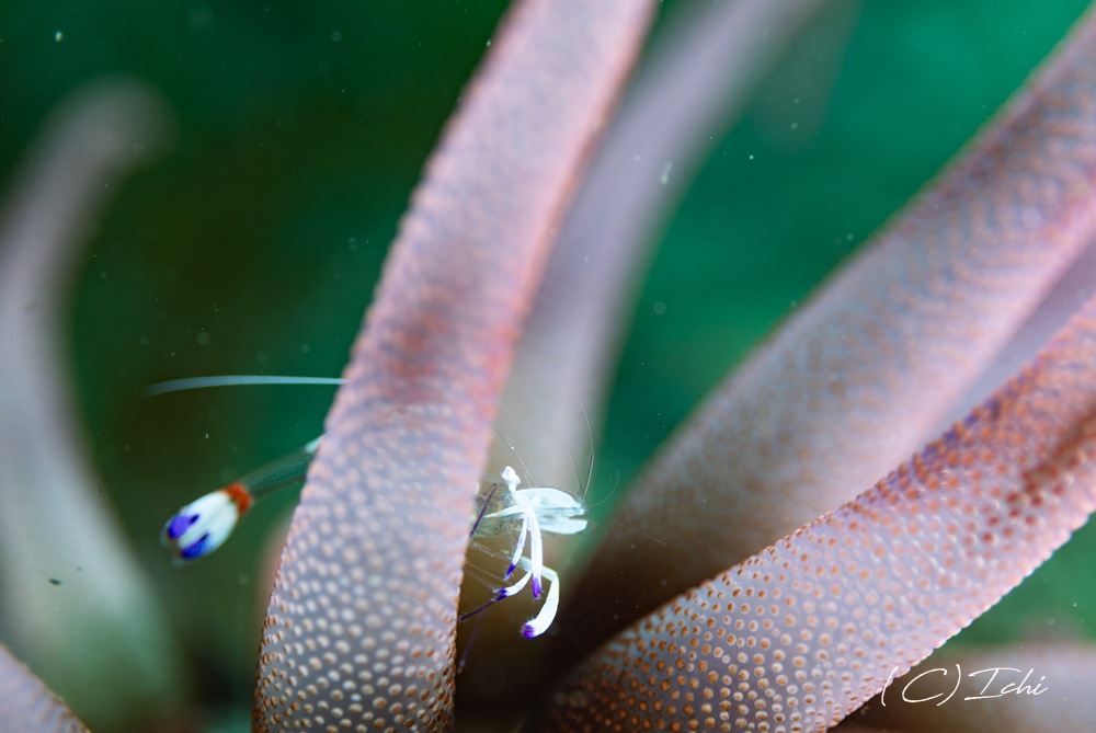 ピンク斑柄のスナイソギンチャクにオドリカクレエビ