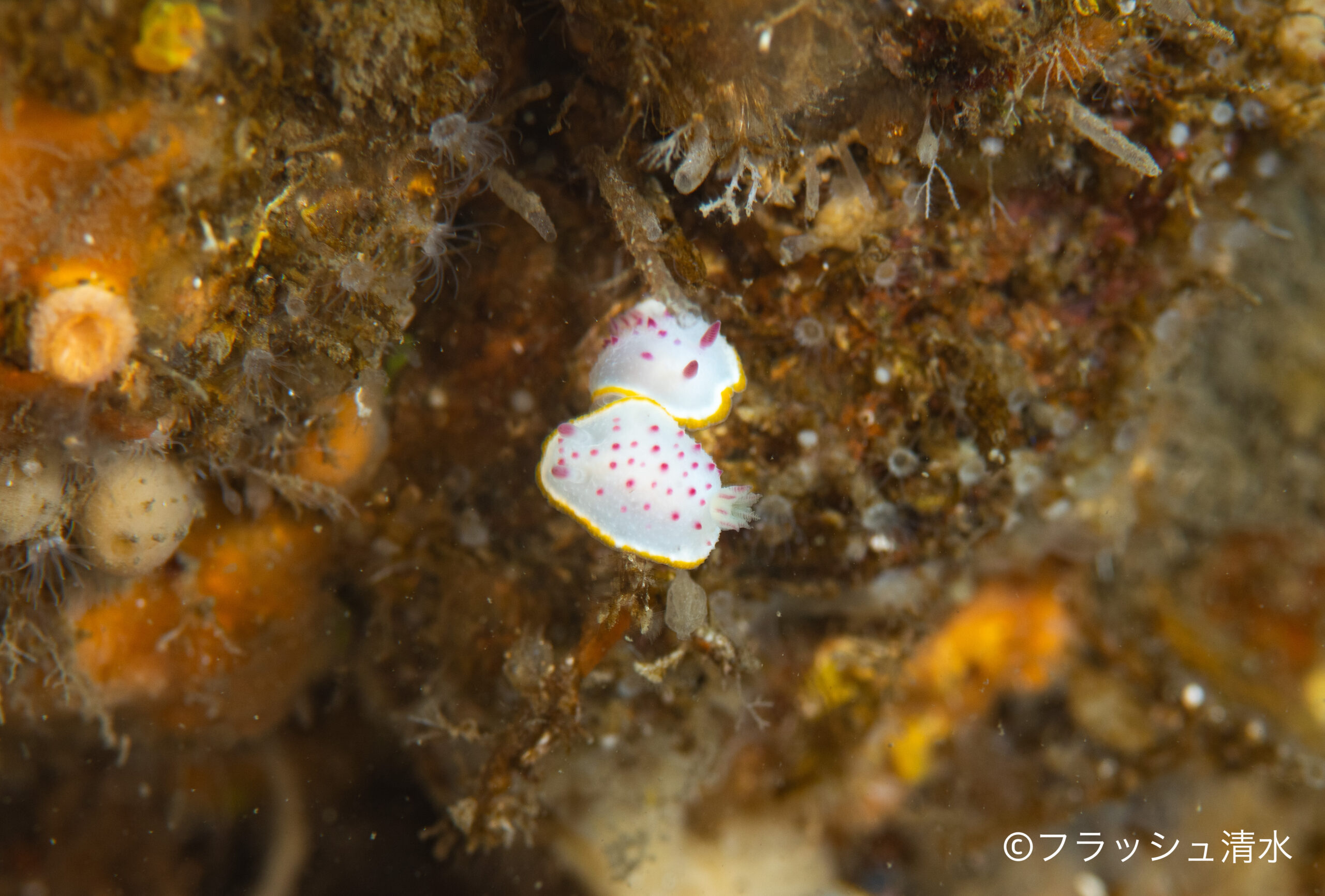 飛び根の先端ではラブラブなクリヤイロウミウシ(この下にさらに3匹固まってました。)